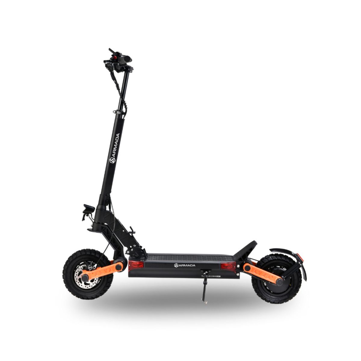 The Armada Elation single or dual motor electric kick scooter, the perfect choice for those in need of some serious power. Sporting a 2000 watt high torque dual motor system, this scooter impressively climbs mountains and tackles tough terrains with ease. The long range 60V18AH battery provides up to 60kms distance, making it a dependable option for longer journeys. This scooter also boasts higher weight limits, accommodating riders up to 264 lbs, and comes equipped with front and rear shocks for a smoother ride. With variable speeds of up to 60kms per hour, a durable frame, and heavy-duty off-road tires, the Armada Elation is the ultimate choice for those seeking a high-performance electric kick scooter.