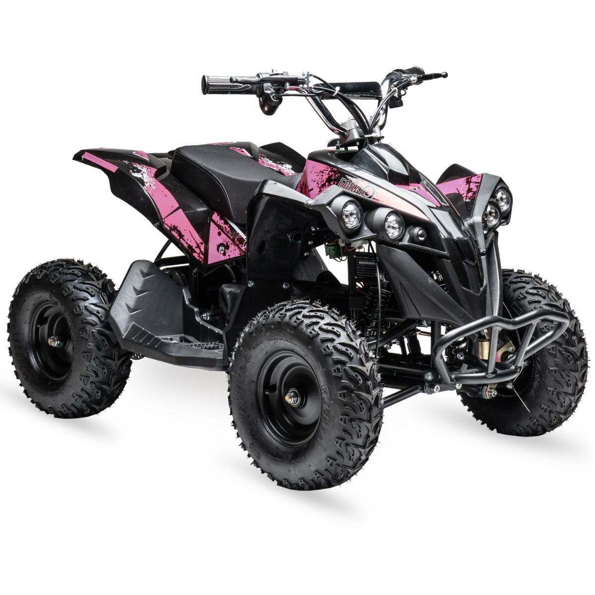 The Rosso eQuad P Kids ATV is a powerful, customizable ride built for young adventurers. Featuring a 36V battery and upgraded 1000W motor, it delivers higher speeds and strong performance for outdoor fun. With interchangeable decals in blue, green, and pink included, kids can personalize their ride anytime. Designed for safety and durability, it includes disc brakes, a 3-speed governor with reverse, parental remote start/stop, and a protective battery system. All-terrain tires, suspension, and rear LED stoplights make it a versatile, confidence-inspiring ATV for any backyard adventure.